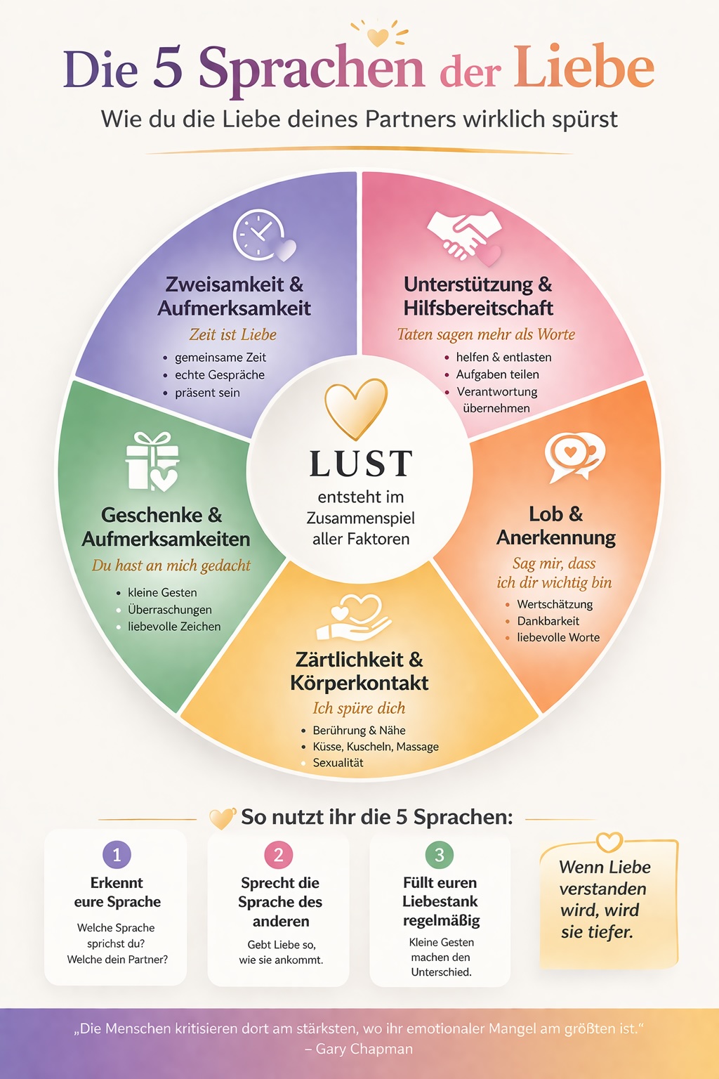 Das Konzept der 5 Sprachen der Liebe von Gary Chapman hilft euch dabei, genau das zu erkennen.